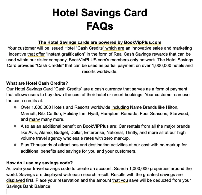 ✔️ Hotel Stays (to over 120+ Destinations) & Hotel Savings Card (used as "cash credits" to over 1,000,000 Hotels & Resorts) Incentives (Regularly $197/mo.)